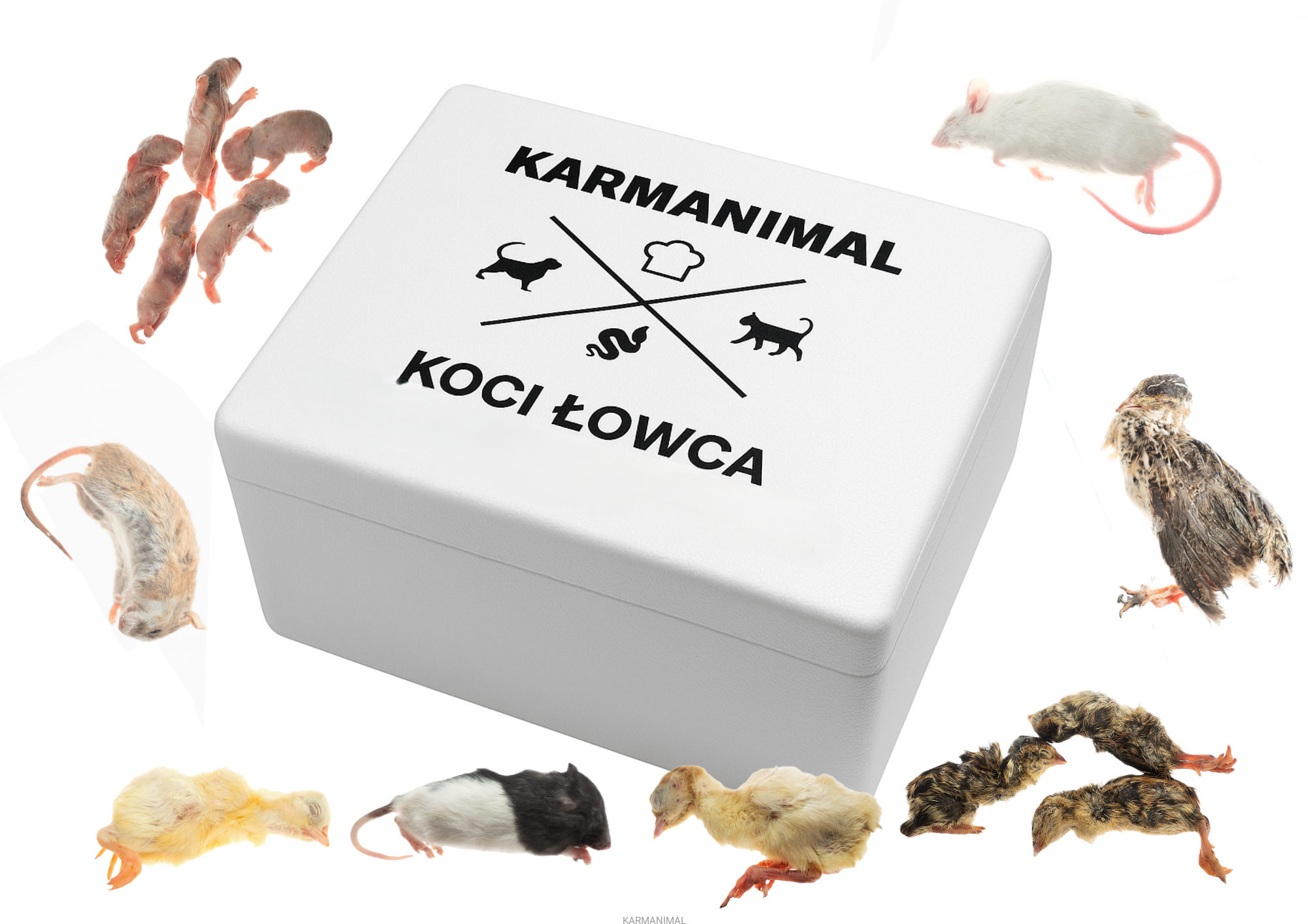 - 100 % whole‑prey: mięso + kości + organy + futro/pióra w naturalnych proporcjach.